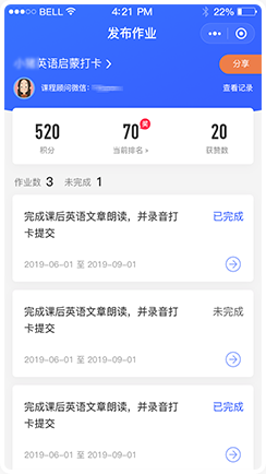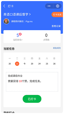 打卡完成任务可获得积分,鼓励学员持续性打卡收集积分