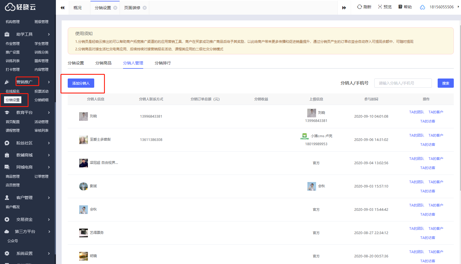 二、关闭小程序的分销员入口,在后台选择添加分销人。1、进入后台-》营销推广-》分销管理-》分销设置-》分销人管理。