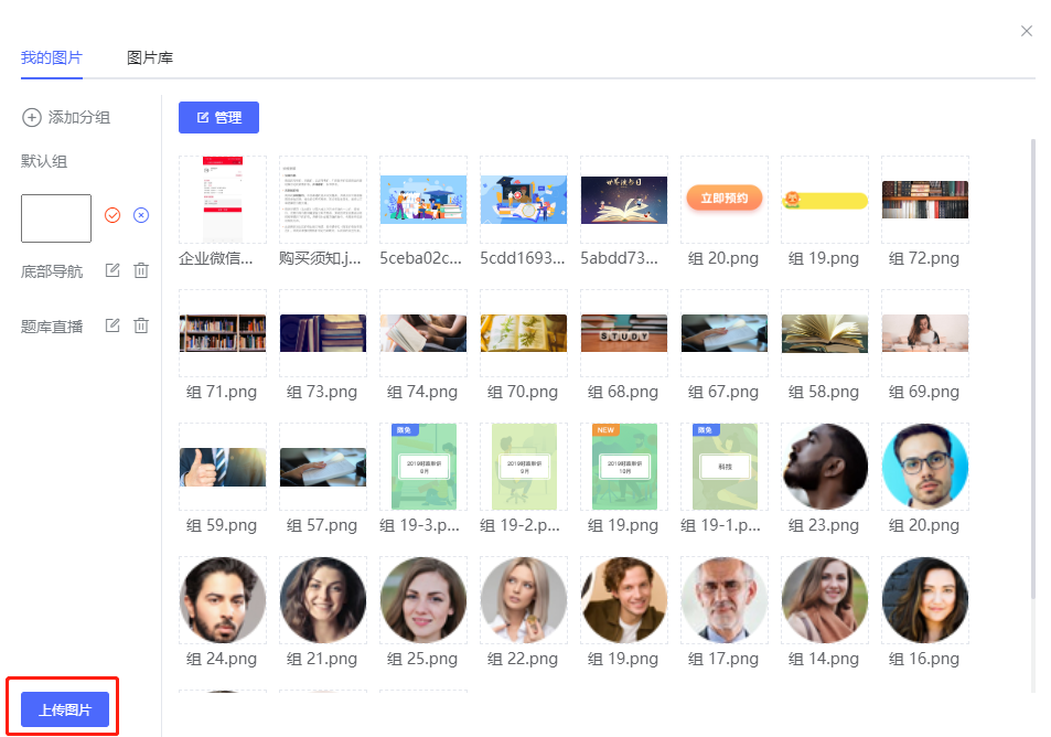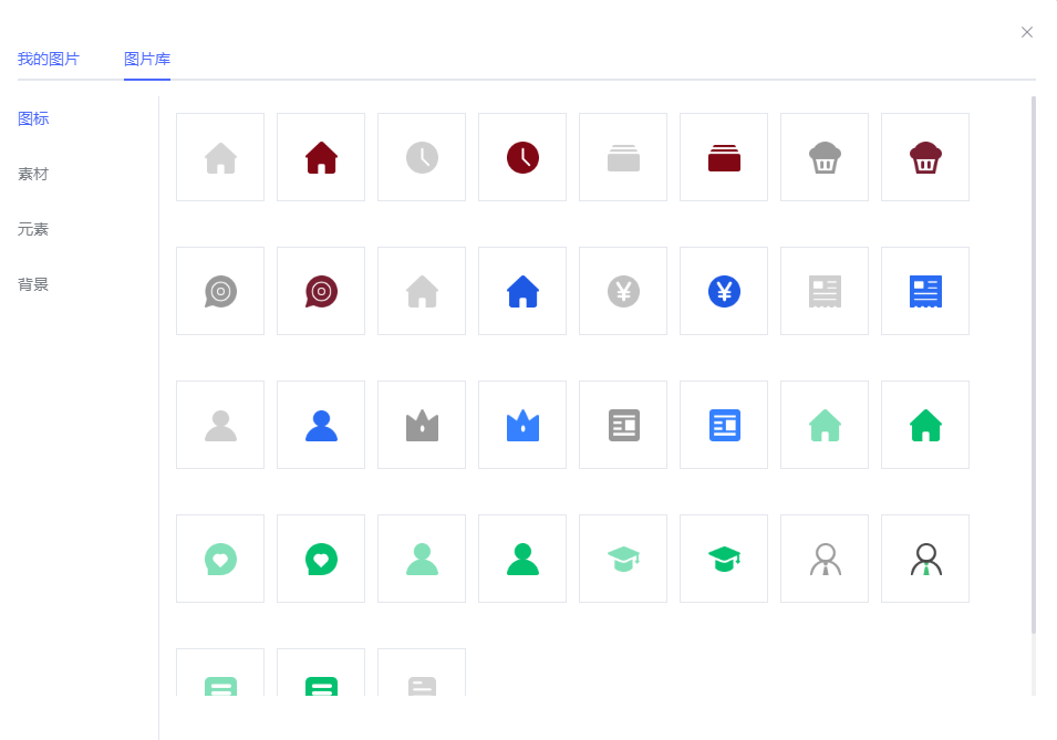 以图片为例,我们在总后台也提供了相当数量的图片素材为用户使用,用户也可上传自定义图片。